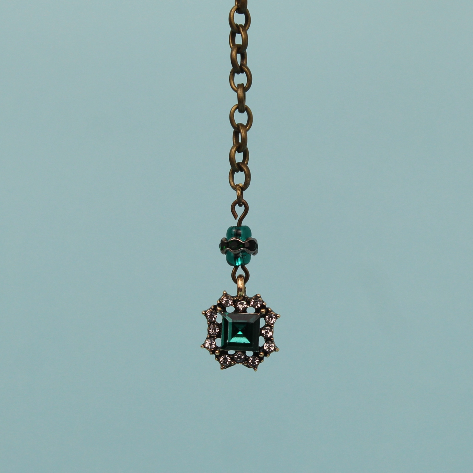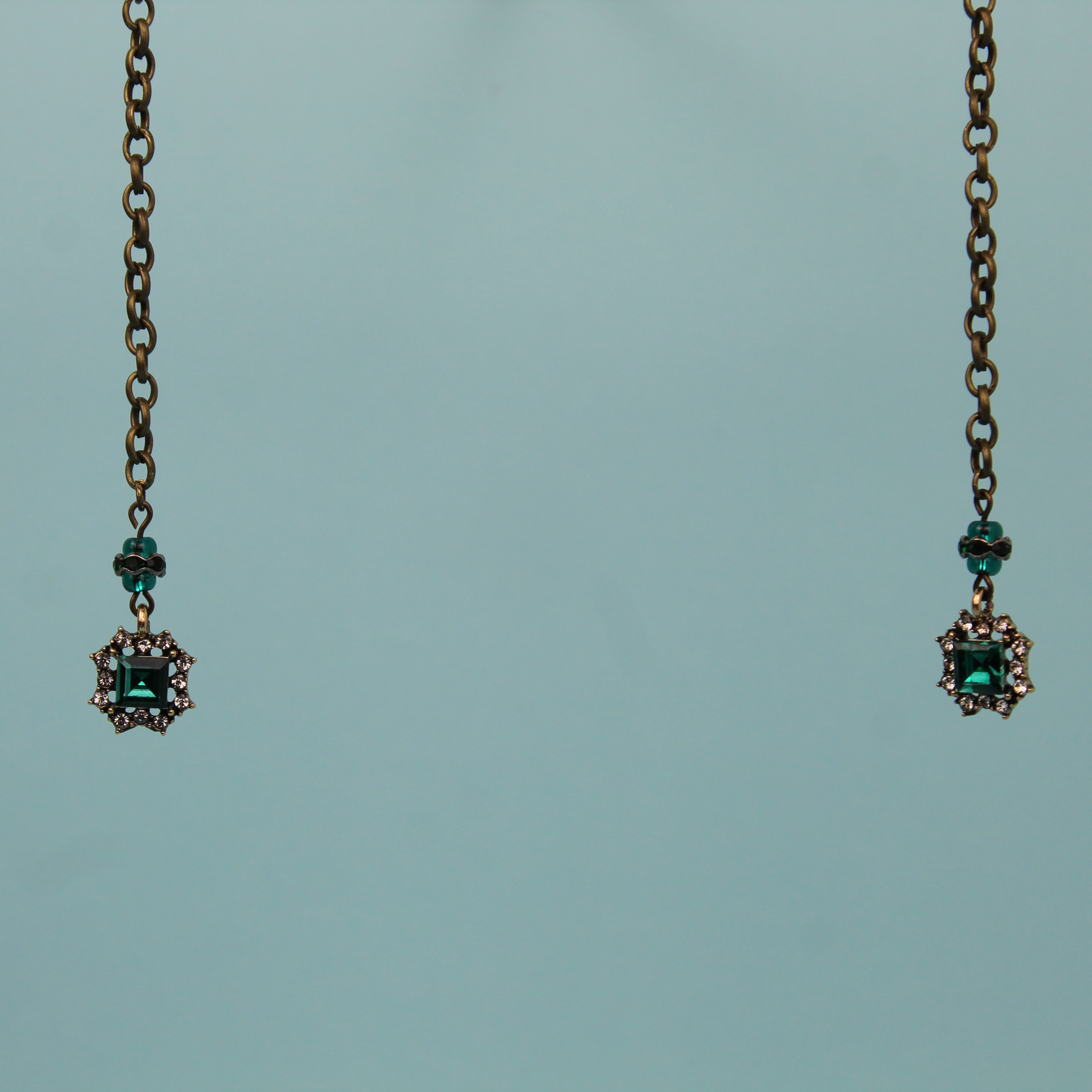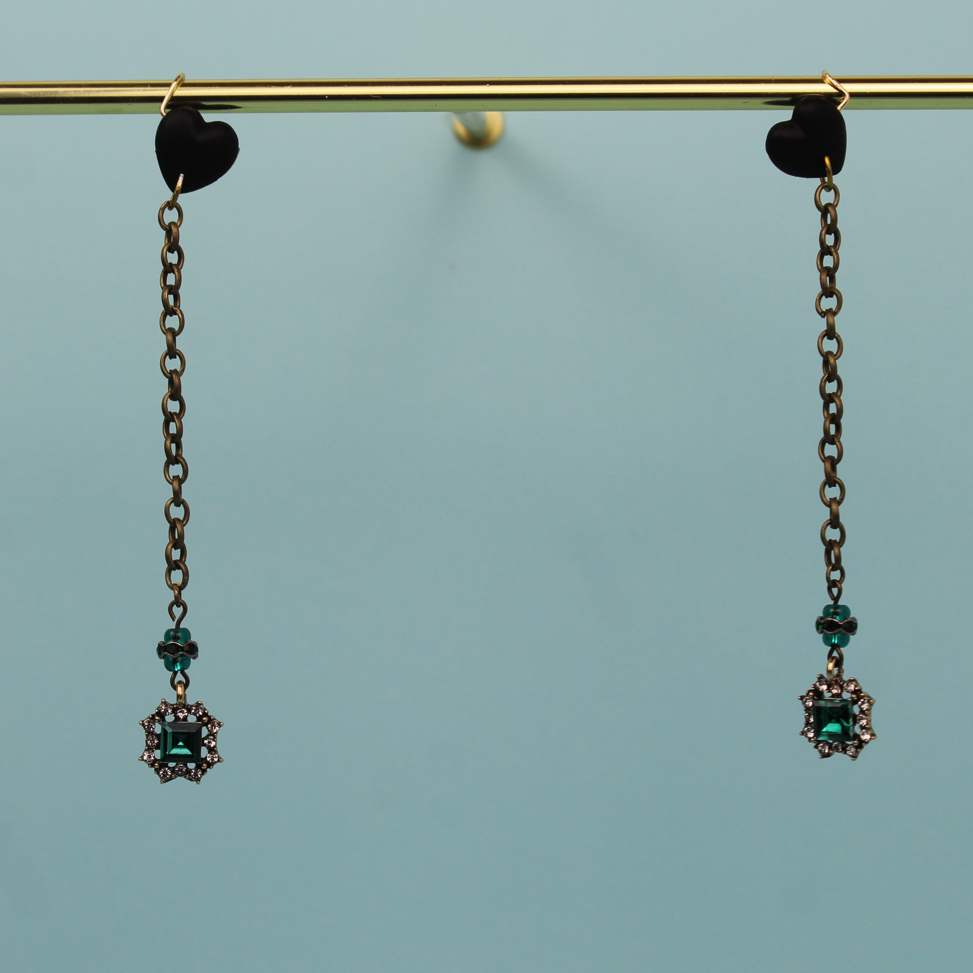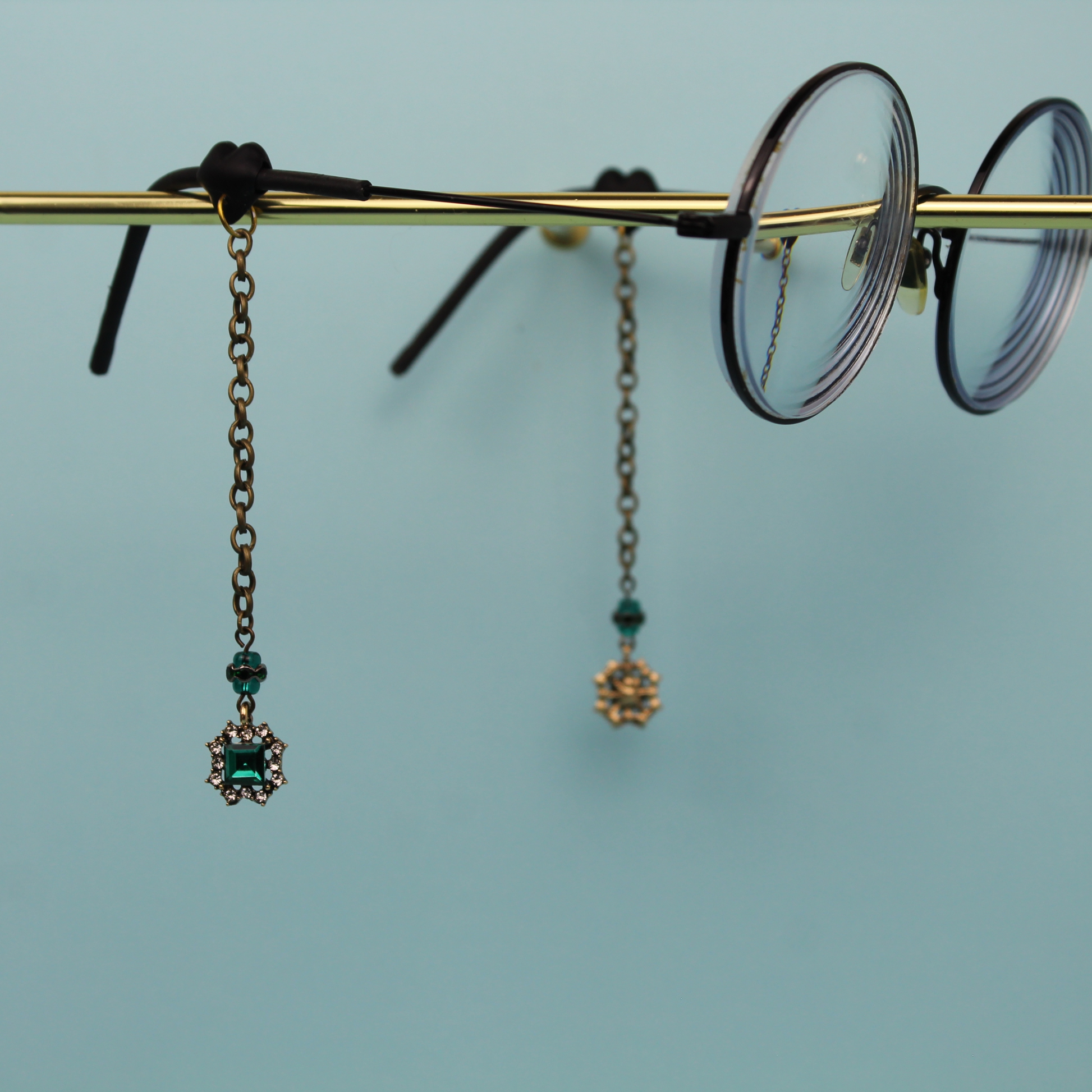 Elegant, moody, and full of vintage allure, the Emerald Noir Glasses Chains are a perfect mix of gothic romance and timeless glam. Each chain features deep green crystal gem framed in antique-style bronze with a touch of sparkle, suspended from a dark metal chain anchored by matte black heart loops. The result? A luxurious accessory that feels both mysterious and refined.