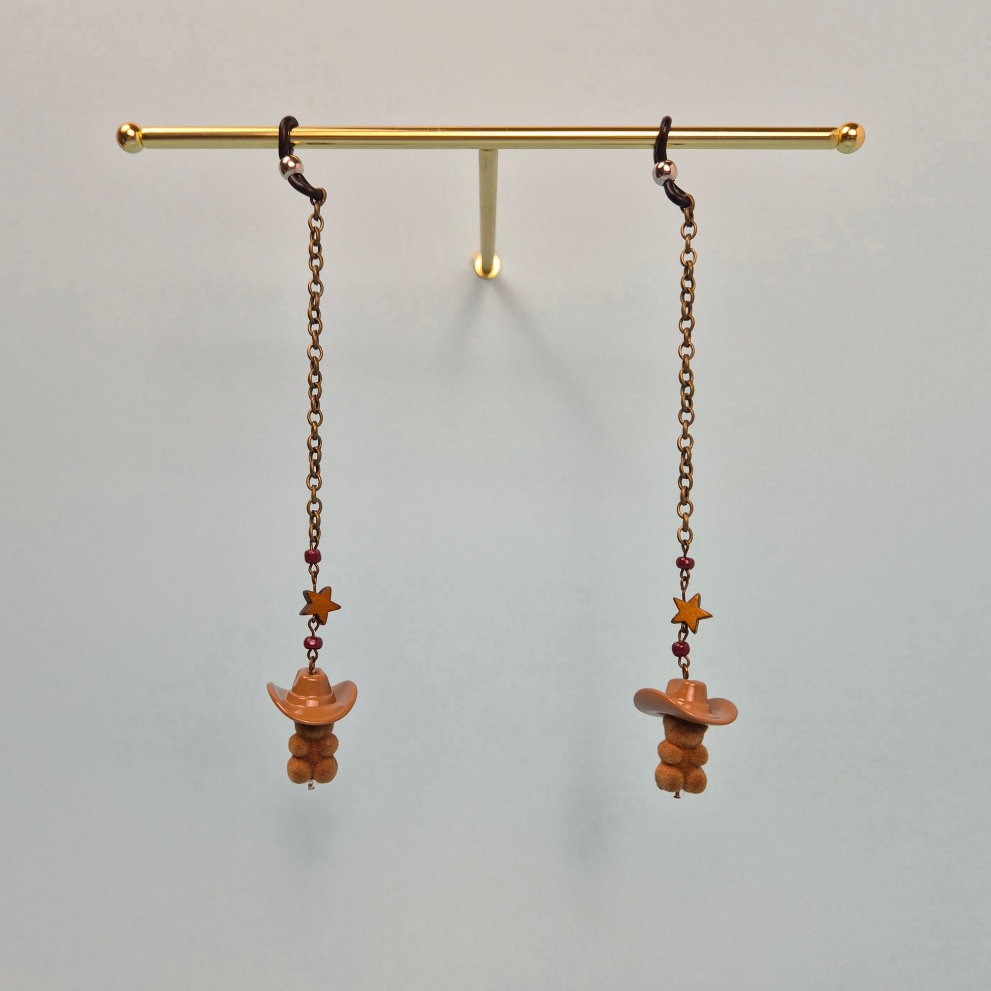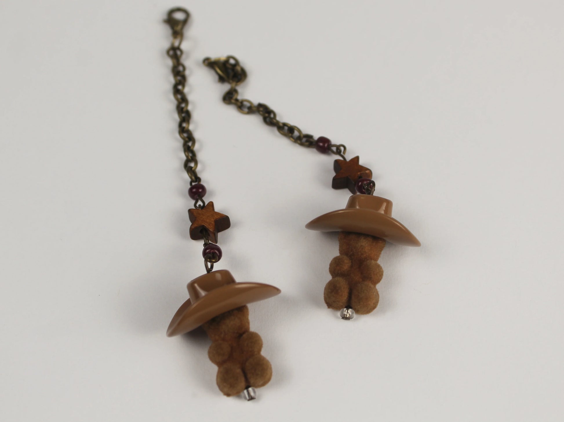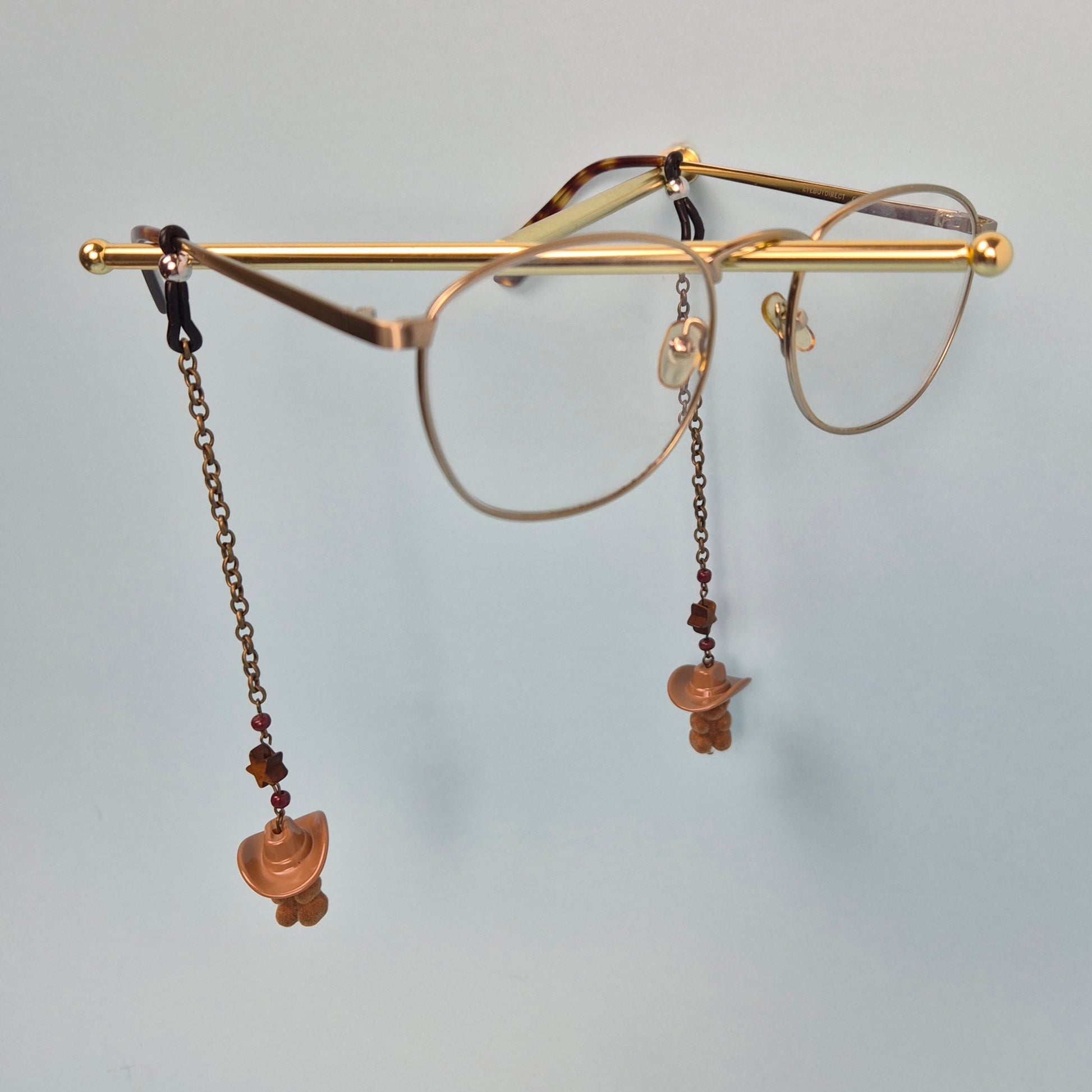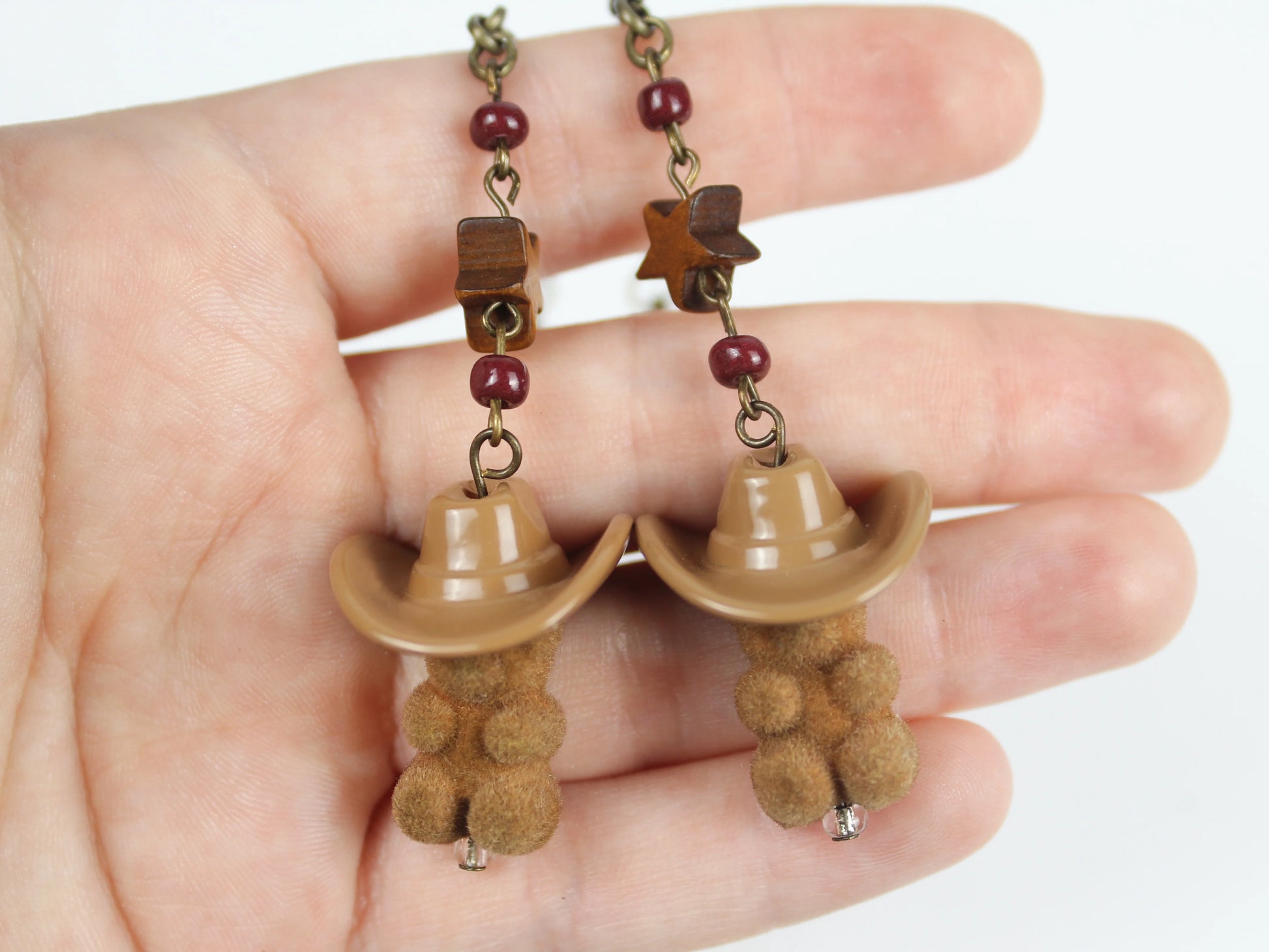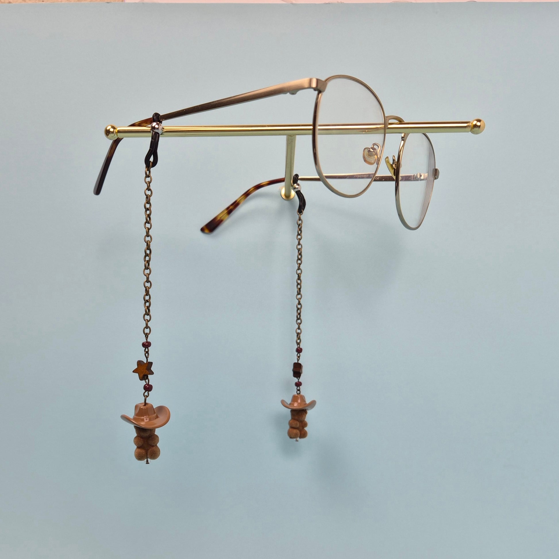 A playful western inspired accessory that brings a touch of cowboy charm to your everyday look. Featuring tiny tan cowboy hats, rustic wooden star beads, and the cutest flocked mini bear beads, these chains capture the spirit of the open range with a whimsical twist.