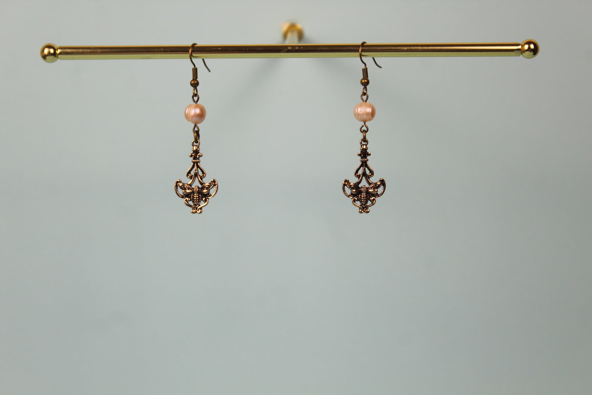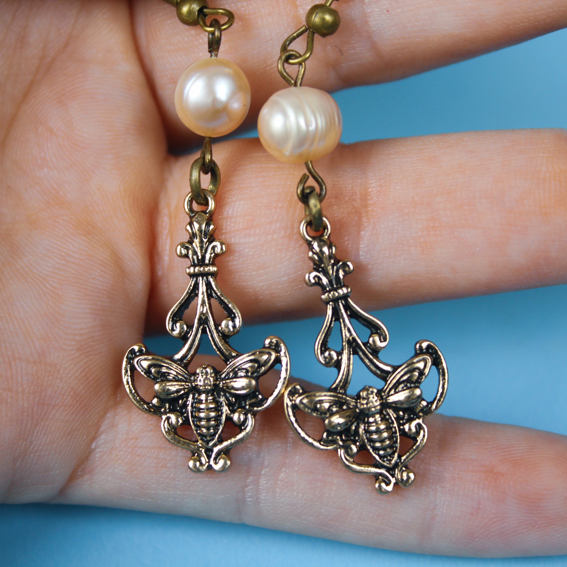 These elegant vintage-inspired bee earrings blend timeless charm with delicate detail. Featuring lustrous freshwater pearls linked to ornate antique-gold tone findings, each earring showcases an intricately detailed bee motif framed by graceful filigree accents. The soft glow of the pearls adds a classic, feminine touch, while the bee design brings a hint of whimsy and symbolism. Truely a perfect choice for nature lovers!