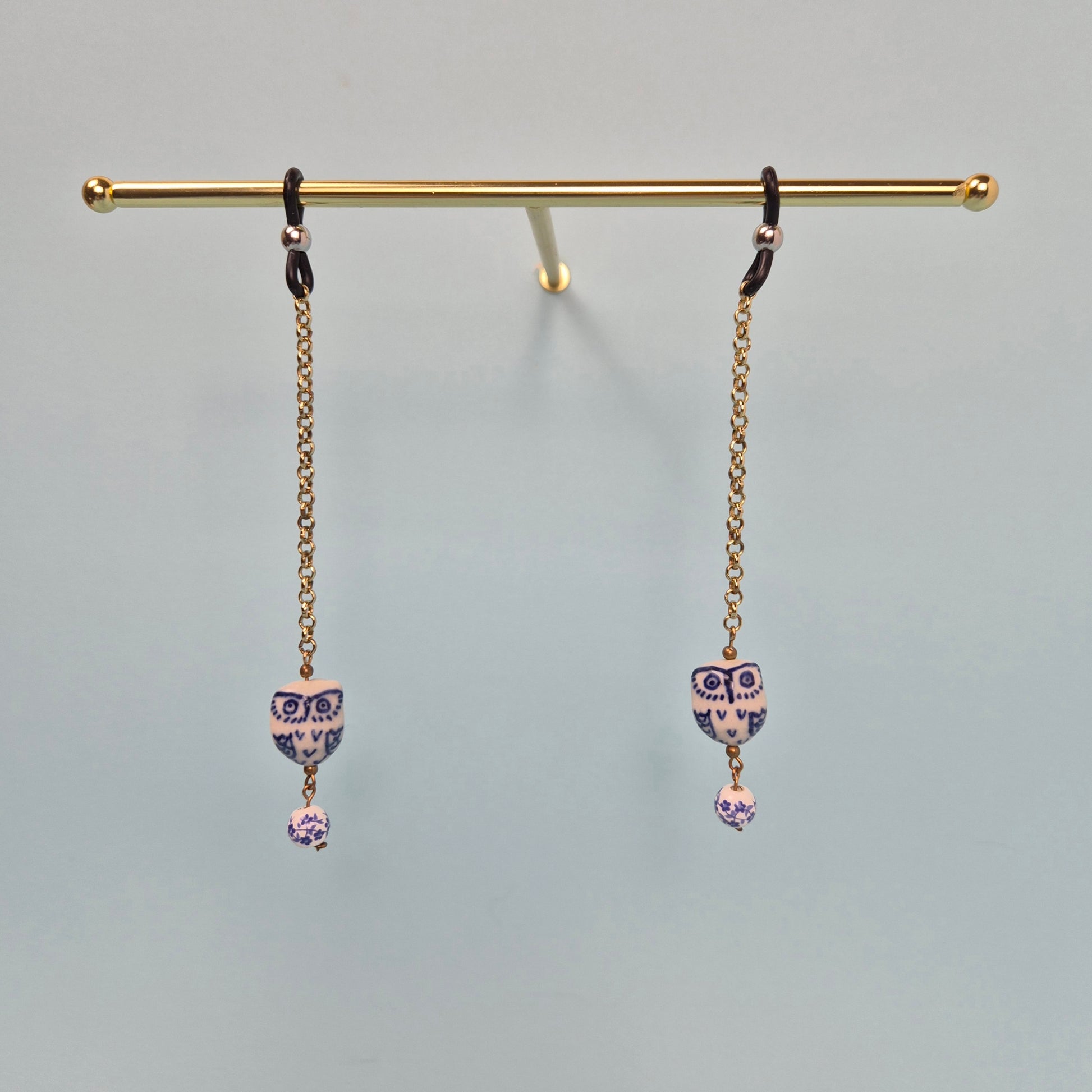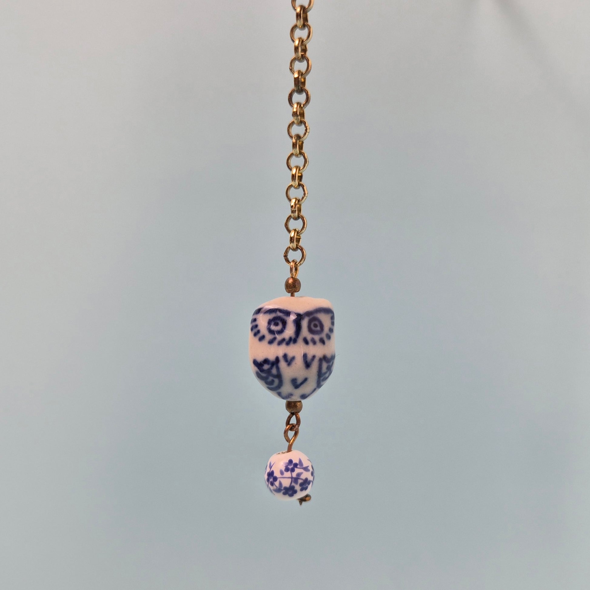 Add a touch of quiet elegance and a hint of whimsy with the Wise Ones. Porcelain style ceramic owl charms in delicate blue and white. Each owl dangles gracefully from a warm gold tone chain, accented by matching patterned beads that shimmer subtly in the light.
